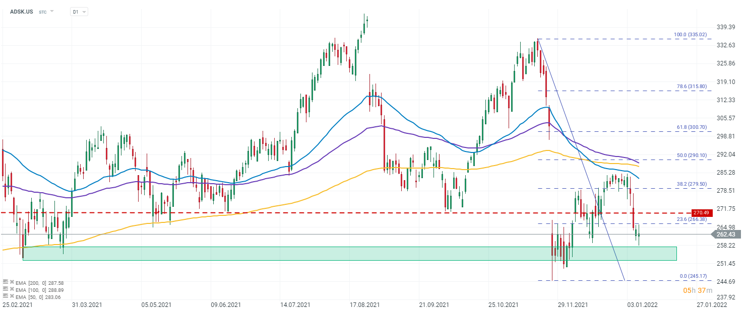 Shares of Autodesk (ADSL.US) are currently struggling to stay above the area of support marked by previous lows (green zone). If the demand side fails to stop the sellers and the mentioned zone is broken down, it is possible to accelerate the fall to the area of the local maximum near $245 per share. On the other hand, if the buyers gain advantage over the market, the next key resistance level is the 23.6% Fibo retracement and the level close to USD 270 per share. Source: xStation 5