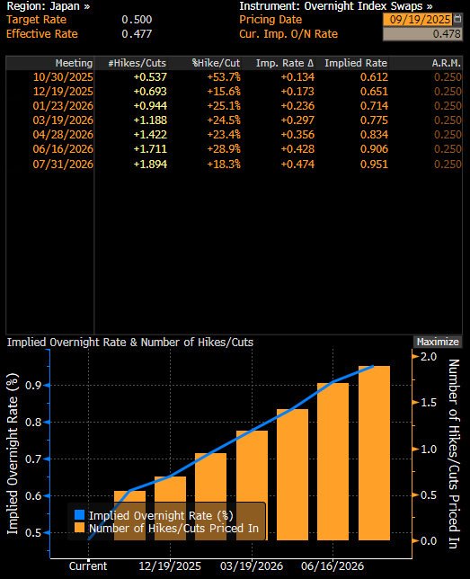 การตัดสินใจครั้งนี้ถูกตีความว่าเป็น “hawkish hold” หุ้นญี่ปุ่นพลิกกลับลง โดยเฉพาะกลุ่มเทคโนโลยีขนาดใหญ่ที่ BOJ ถือหุ้นอยู่มาก ขณะที่กลุ่มธนาคารถูกมองว่าได้ประโยชน์จากการปรับสมดุลงบดุล USDJPY ร่วงกว่า 0.52% ทันทีหลังประกาศ และตลาดสวอปเร่งปรับราคาใหม่ให้โอกาสขึ้นดอกเบี้ยเดือนตุลาคมอยู่ที่ 53%