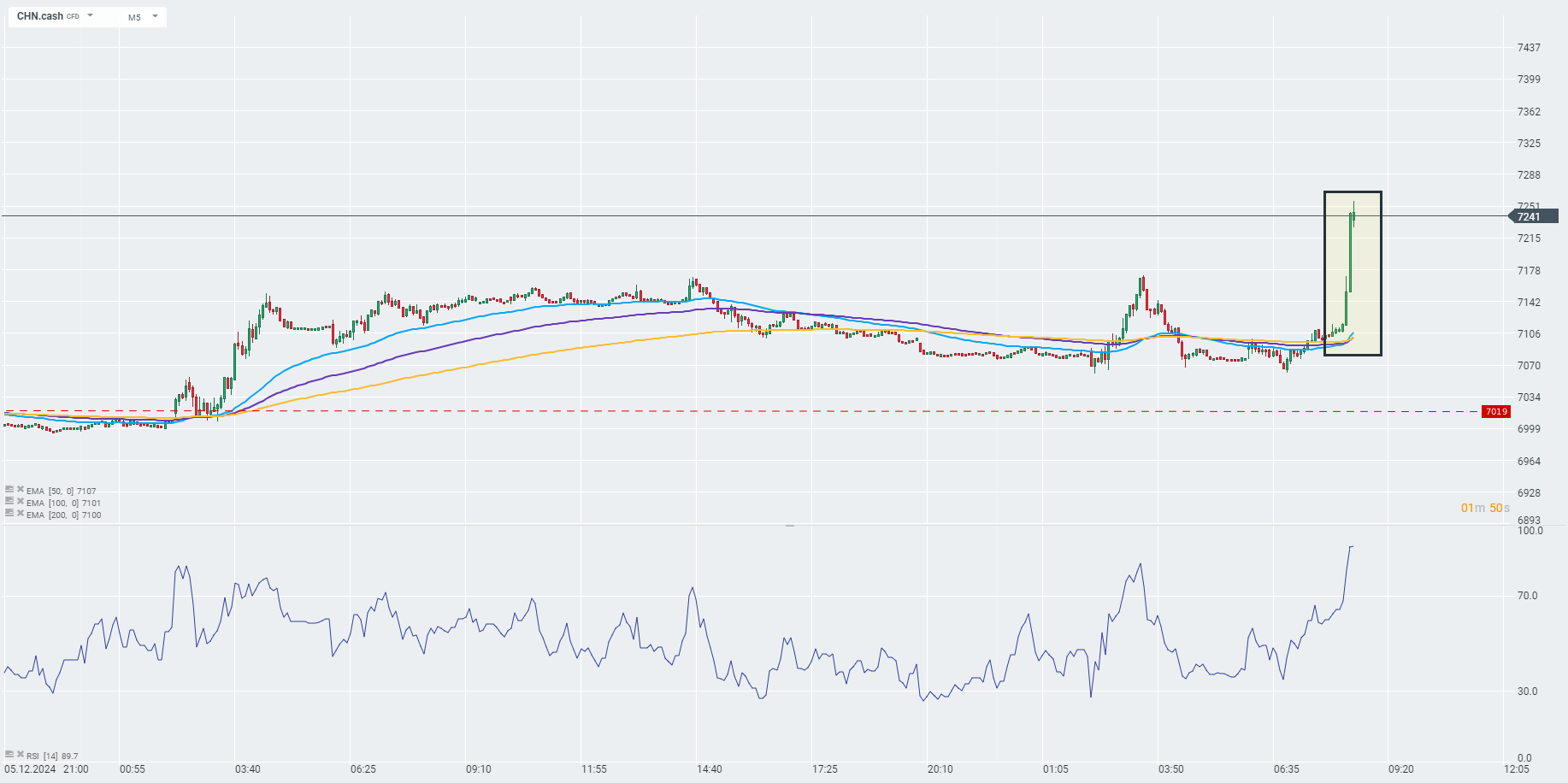 จีนเปลี่ยนจุดยืนนโยบายการเงินเป็นครั้งแรกนับตั้งแต่ปี 2011 หลังจากที่หัวข้อข่าวนี้ถูกเผยแพร่ในสื่อ ดัชนีจีนก็เพิ่มขึ้นอย่างรวดเร็ว ส่งผลให้ CHN.cash ลดลงมากกว่า 2% ในเวลาเพียง 15 นาที