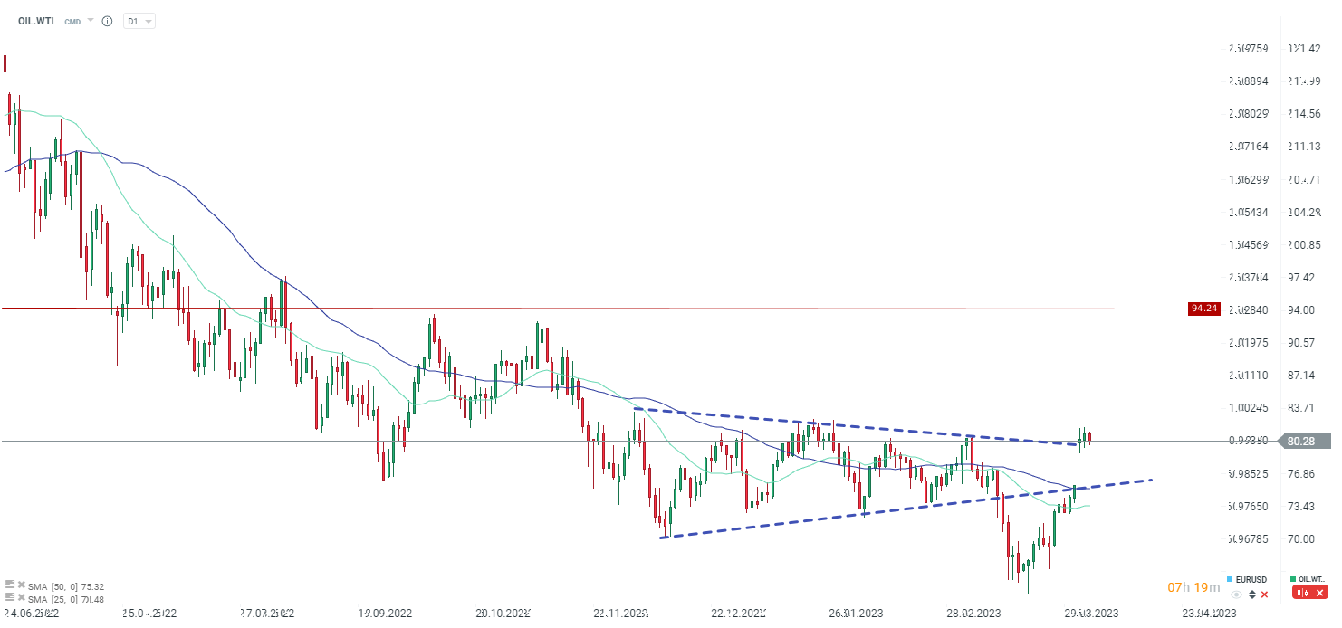 We are potentially seeing a peak in comparative inventories (inverted axis). This could be a pro-growth signal on oil, but on the other hand, economically, oil could be in trouble due to recession concerns. Nevertheless, OPEC+ is cutting production, there will be less oil on the market, which could prompt the inventories to fall further in the US. Source: Bloomberg, XTB