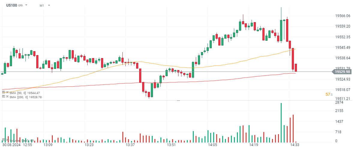 US July PCE price index ex-food/energy/housing came in at 0.1% MoM pace, with ex-energy/housing 0.2% higher on a monthly basis. Quite surprisingly, US100 loses in first reaction after US data, which are signalling further disinflation and solid income / consumer trend across the US economy. Short-term rate-futures on Federal Reserve interest rates, continue to price in a 25 bps Fed rate cut in Sept and 100 bps rate cuts in 2024.