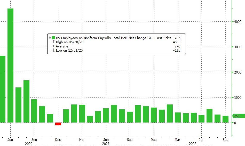 Commenting on the report, Bloomberg chief economist Anna Wong wrote “the jobs report for October sends mixed signals about the labor market, with one survey showing robust job gains while another shows a big jump in unemployment. Filtering the noise in the data, our takeaway is that the labor market is still very tight and much adjustment still needs to occur before unemployment is close to a neutral level. We expect that the Fed will ultimately have to raise rates to 5% next year.”