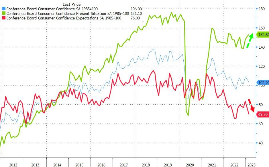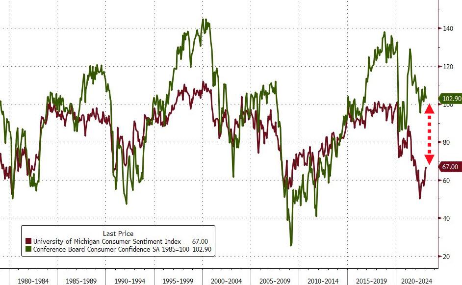 Divergence between University of Michgans sentiment index and Conference Board consumer confidence index is still wide. Source: Bloomberg via ZeroHedge