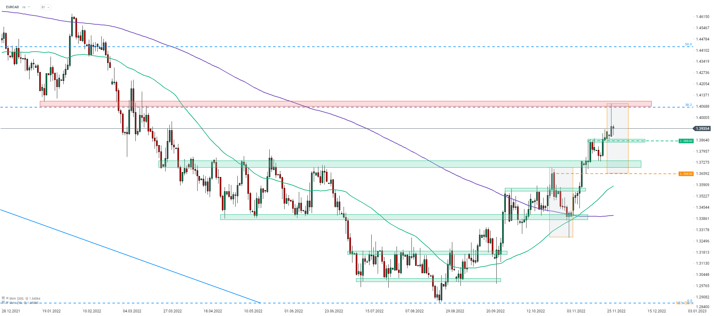 EURCAD leaped higher yesterday and tested 38.2% retracement of the post-pandemic downward move in the 1.4065 area. Bulls failed to break above and the pair started to pull back. Majority of yesterday's daily gain was erased and the pair is trading slightly lower today. However, it is trading off today's daily lows. The pair may remain active with peak volatility expected in the early afternoon. This is because the German CPI report for November and Canadian GDP report for Q3 2022 will be released today at 1:00 pm GMT and 1:30 pm GMT, respectively.