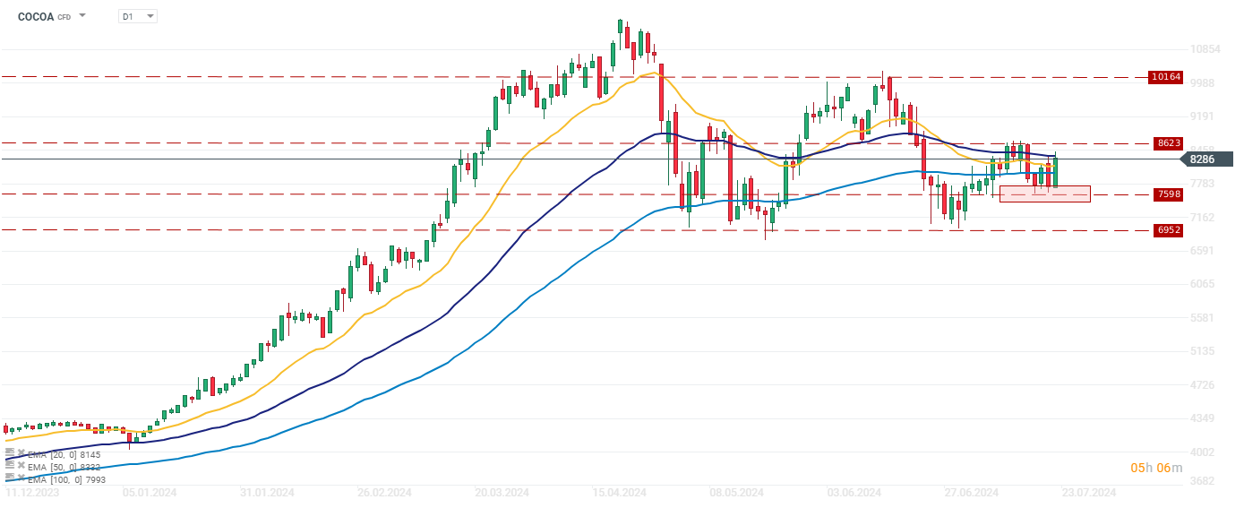 Cocoa is gaining more than 7% today, bouncing off the consolidation zone near $7500 and back above $8000, thus piercing the 100-day exponential moving average (EMA100). The first significant resistance level is drawn on the chart near $8600. Source: xStation