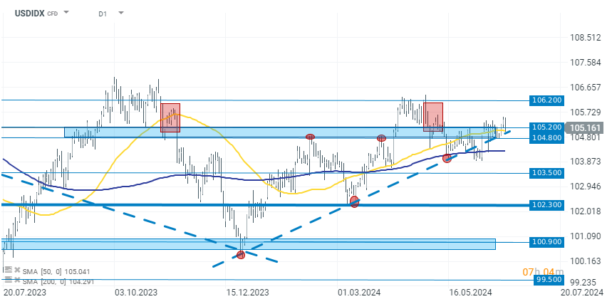 The USD dollar has been one of the stronger G10 currencies recently. However, today we are seeing a definite pullback and declines. The USDIDX index is losing 0.40% and is retesting the uptrend line (blue dashed line). If it is broken, the next support zone remains the levels of 104.00 points and 103.50 respectively.