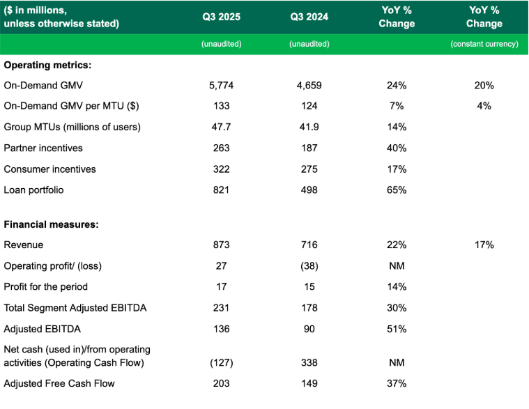 ในไตรมาสที่ 3 ปี 2025 รายได้ของบริษัทอยู่ที่ 873 ล้าน USD เพิ่มขึ้น 22% เมื่อเปรียบเทียบกับปีเดียวกัน และเพิ่มขึ้น 17% โดยคำนึงถึงอัตราแลกเปลี่ยนคงที่ เนื่องจากการเติบโตอย่างสม่ำเสมอในทั้งสองด้านคือ On-Demand และบริการทางการเงิน GMV On-Demand อยู่ที่ 5.8 พันล้าน USD เพิ่มขึ้น 24% เมื่อเทียบเป็นรายปี (20% โดยคำนึงถึงอัตราแลกเปลี่ยนคงที่) ได้รับแรงหนุนจากจำนวนผู้ใช้ที่ทำธุรกรรมเพิ่มขึ้น 16% และจำนวนธุรกรรมรวมเพิ่มขึ้น 27% GMV ต่อผู้ใช้ก็มีการปรับปรุงโดยคำนึงถึงอัตราแลกเปลี่ยนคงที่เช่นกัน