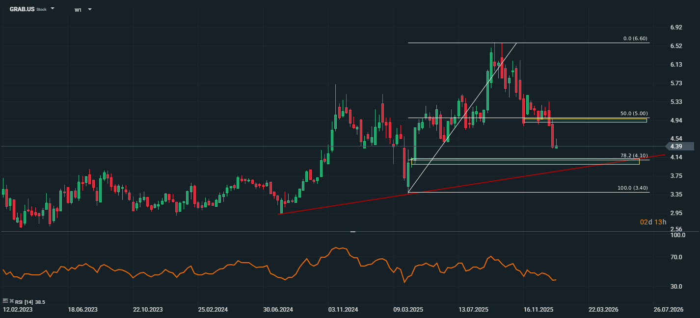 กราฟหุ้นของ Grab, กรอบเวลา W1. แหล่งที่มา: xStation5