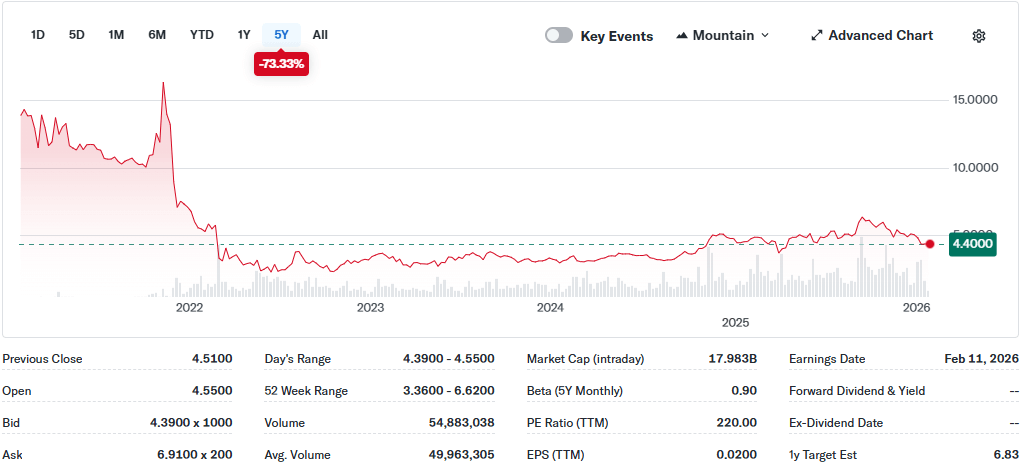 ในมุมมองด้านเทคนิค หลังจากที่แตะจุดสูงสุดในระยะสั้นที่ 6.59 ดอลลาร์ หุ้นได้มีการปรับตัวลดลงอย่างมากประมาณ 33% และขณะนี้ได้ถอยกลับมาอยู่ในบริเวณ 4.4 ดอลลาร์ การทะลุผ่านระดับแนวรับที่ 5 ดอลลาร์ก่อนหน้านี้ได้กระตุ้นให้เกิดแรงขายอย่างมาก และมีแนวโน้มที่จะยังคงดันราคาให้ค้นหาบริเวณแนวรับที่ลึกกว่านี้ บริเวณราคาประมาณ 4 ดอลลาร์ถือเป็นระดับแนวรับที่สำคัญ ซึ่งรวมตัวกันของปัจจัยทางเทคนิคเช่นระดับ Fibonacci 78.2% และเส้นแนวโน้มขาขึ้นในระยะกลาง การรวมกันนี้สร้างจุดยึดที่มั่นคง และหากแรงซื้อยังคงมีอยู่ โอกาสในการวัฏจักรขาขึ้นใหม่ก็มีความเป็นไปได้อย่างเต็มที่