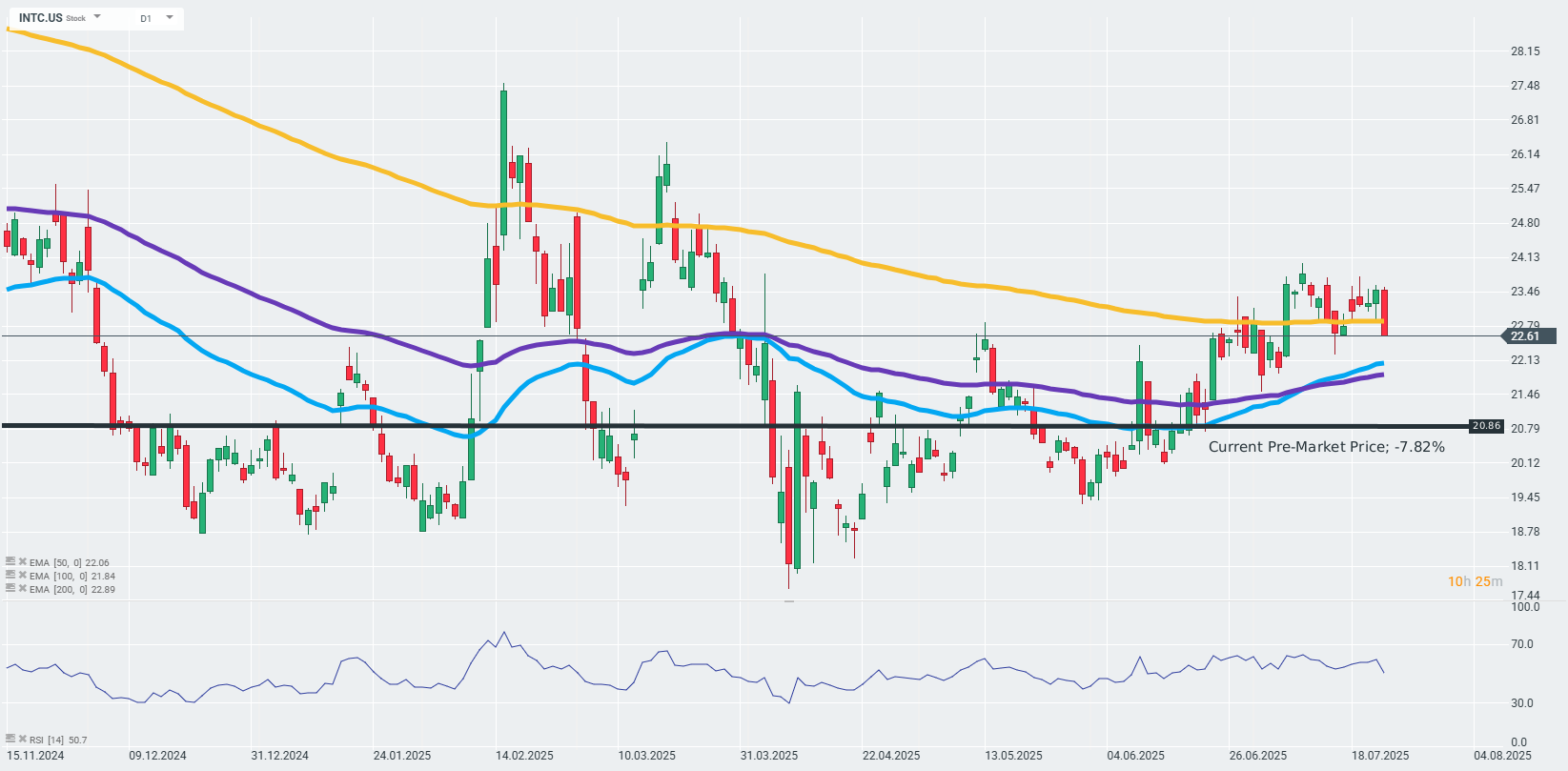 หุ้น Intel (INTC.US) ร่วงลงหลังจากรายงานผลประกอบการไตรมาสล่าสุด โดยสาเหตุหลักมาจากการประกาศปลดพนักงานจำนวนมาก (15% ของพนักงานทั้งหมด หรือประมาณ 15,000–24,000 คน), การยกเลิกแผนการลงทุนหลายพันล้านดอลลาร์ในการสร้างโรงงานใหม่ (ในเยอรมนี, โปแลนด์, คอสตาริกา รวมถึงความล่าช้าในโอไฮโอ) และเสียงวิจารณ์อย่างรุนแรงต่อกลยุทธ์อันมีค่าใช้จ่ายสูงของอดีต CEO นักลงทุนมองว่าการกระทำเหล่านี้เป็นสัญญาณของการเปลี่ยนแปลงจากแผนพัฒนาเทคโนโลยีที่ทะเยอทะยาน ไปสู่การลดต้นทุนอย่างรุนแรงและปรับโครงสร้างเพื่อความอยู่รอด ซึ่งอาจแลกมาด้วยการเติบโตในอนาคต