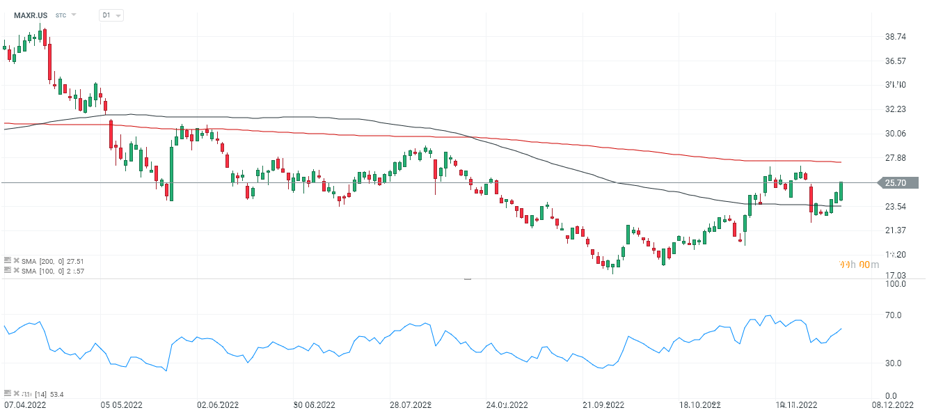 Maxar Technologies (MAXR.US) shares, D1 interval. The price since May this year has been moving below the 200-session average (red line) which is the main resistance for bulls and runs around $27 per share. The demand side may want to test its strength; previous attempts in November ended in a sell-off, forming a bearish double peak formation. However, the bulls managed to erase the declines completely, and today's pre-opening market quotes indicate an opening above $26. Source: xStation5