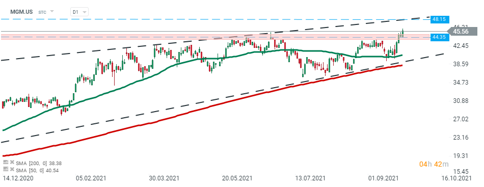 MGM Resorts (MGM.US) stock broke above major resistance at $44.35 and reached its highest level since June 2008. If current sentiment prevails, the upward move may accelerate towards the upper limit of the wedge formation at $48.15. Source: xStation5