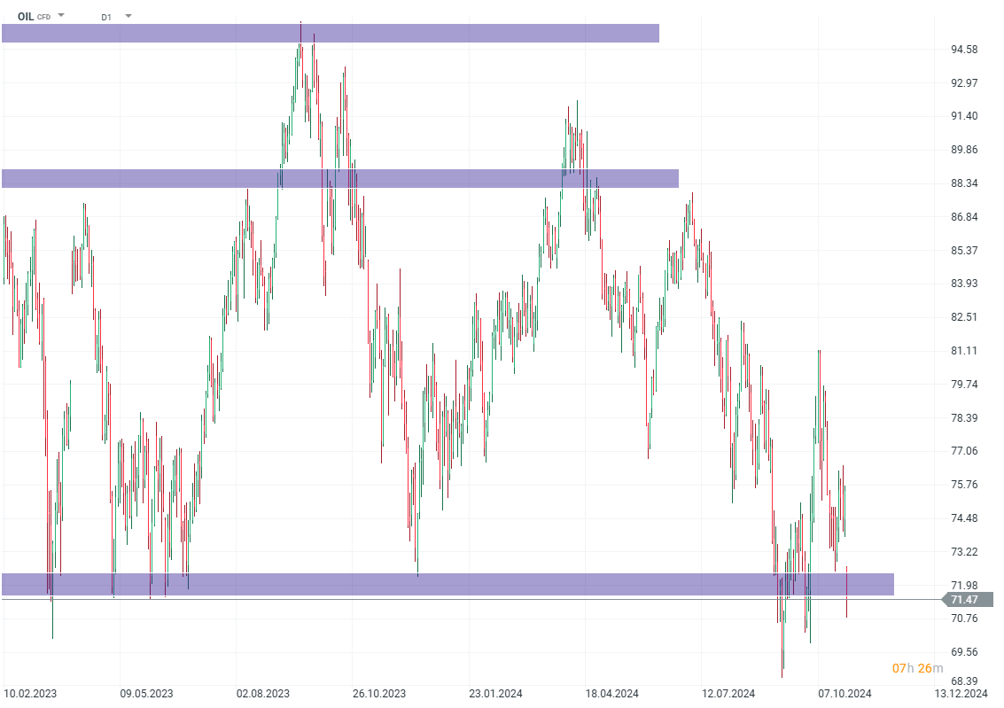 With this out of the picture – at least for the time being – the oil market returns to demand worries and the priced are under a firm downward pressure. On the chart of OIL one can see bulls once again struggling around the key support area and potentially paving the way for more downside.