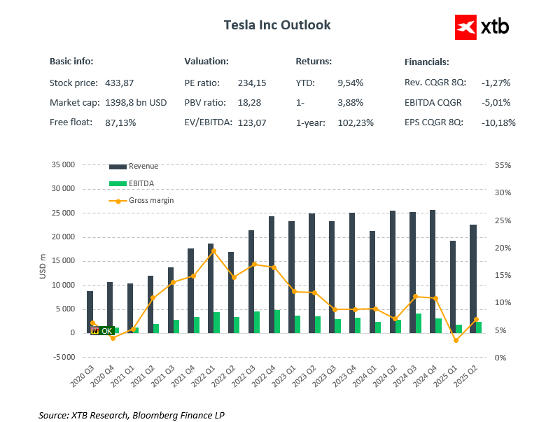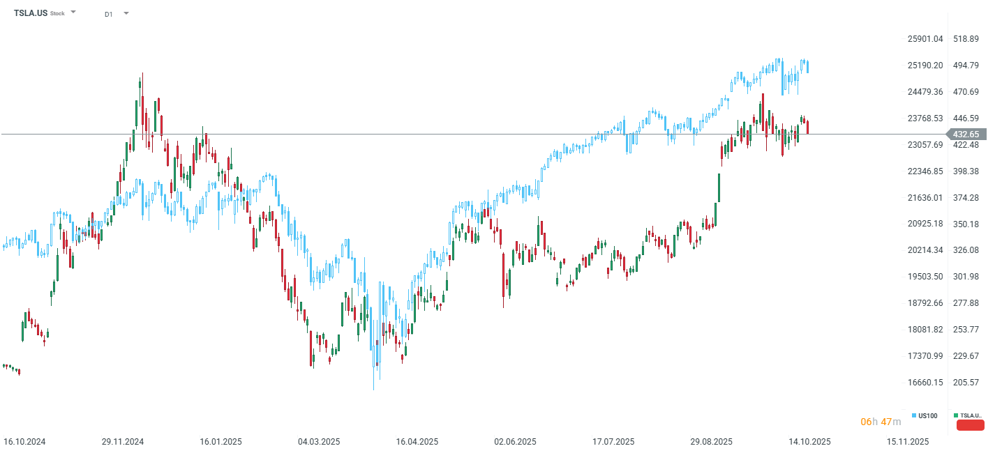 Tesla พร้อมรายงาน ผลประกอบการ Q3 ที่แข็งแกร่ง แม้ขับเคลื่อนด้วยยอดขายรถยนต์เชิงรุก ราคาหุ้นสะท้อน การประเมินมูลค่าสูง (P/E ~200) แต่มีเหตุผลสนับสนุนจากแผนระยะยาวด้าน รถยนต์ขับเคลื่อนอัตโนมัติและหุ่นยนต์ ราคาหุ้นมีแนวโน้มแกว่ง ±6–7% หลังผลประกอบการ ซึ่งอาจทำให้ขึ้นสู่ระดับสูงสุดตั้งแต่ธันวาคมปีที่แล้ว หรือร่วงสู่จุดต่ำสุดตั้งแต่กลางกันยายน