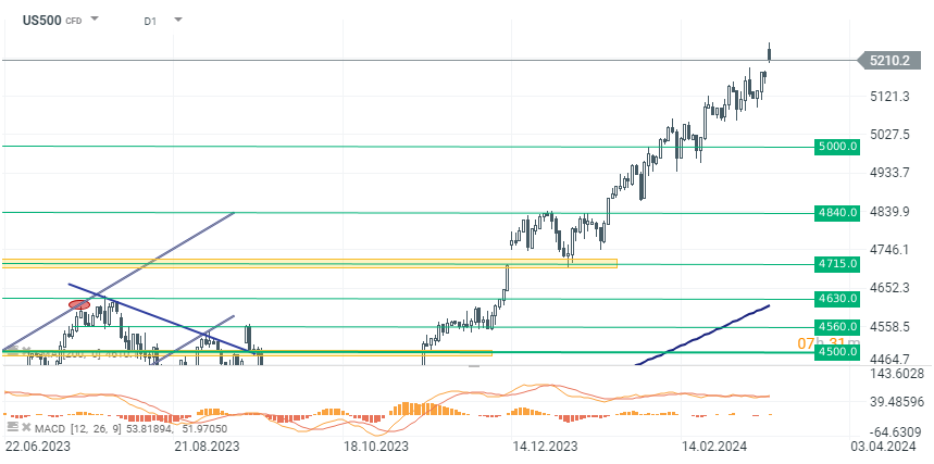 Today we observe much higher levels in contracts, due to the rollover that took place between yesterday and today. Nonetheless, the scale of increases in the indices in recent weeks has been large, and there hasn't been any significant correction along the way. At the time of publication in the U.S. market, we are witnessing slight declines and a strong rise in the dollar's value, which could be a sign of the first breathlessness in a long time. In such a scenario, the next support level to watch is 5000 points.