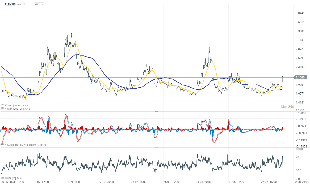 Tilray (TLRY.US) stock gains 16.50% as the company reported a 24% year-over-year increase in revenue for the fourth fiscal quarter, with a notable 127% increase in beverage-alcohol revenue to $76.7 million. The company also saw a 146% rise in gross profit within this key segment. Tilray significantly reduced its quarterly loss to $15.4 million from the previous year's $119.8 million, largely due to reductions in non-cash expenses.