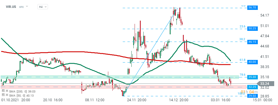 Vir Biotechnology (VIR.US) stock rose nearly 9.0% in premarket, however later in the session bullish momentum faded away. Buyers failed to break above the local resistance zone at $35.30 which is marked with 78.6% Fibonacci retracement of the last upward wave and price pulled back to recent lows at $32.25. Source: xStation5