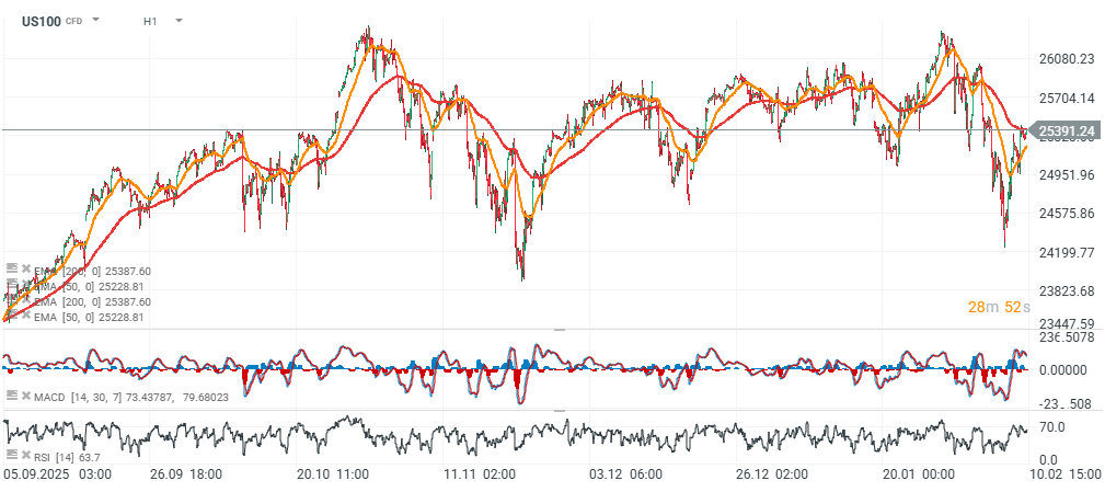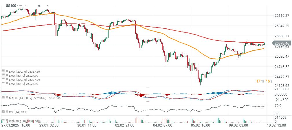 Nasdaq 100 Futures (US100) ปรับตัวขึ้น 0.15% ในวันนี้ เคลื่อนตัวใกล้ระดับ 26,000 จุด ดัชนีดูเหมือนจะเหลือเพียงก้าวเดียวจากระดับสูงสุดเป็นประวัติการณ์ แม้ว่าหุ้นเทคโนโลยีรายใหญ่บางตัว เช่น Microsoft และ Palantir จะยังคงปรับตัวลดลง