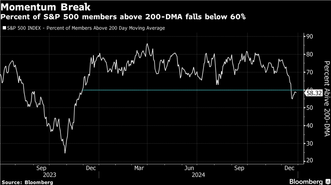 The selloff highlights growing concerns about market breadth, with less than 60% of S&P 500 companies now trading above their 200-day moving averages - the weakest level this year. This technical deterioration suggests the market's recent gains have been increasingly concentrated in a handful of large-cap tech names, raising vulnerability to sharp corrections.