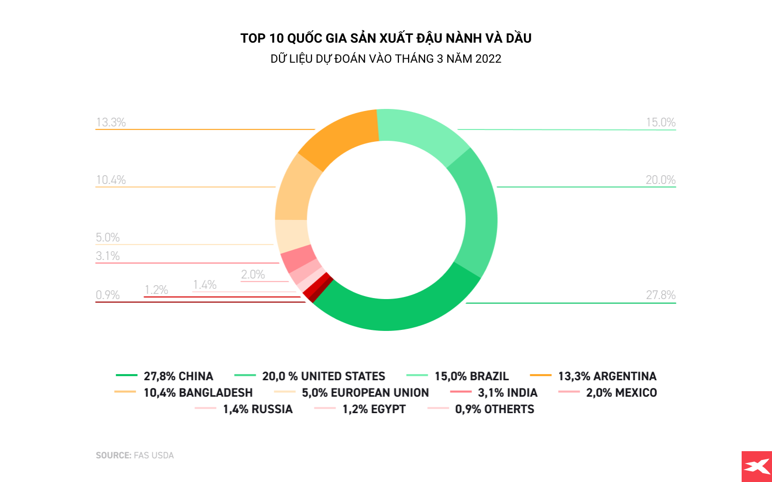 Top 10 quốc gia sản xuất dầu và đậu nành tính theo sản lượng thế giới. Trung Quốc, Hoa Kỳ, Brazil và Argentina là những nhà sản xuất và tiêu thụ dầu đậu nành lớn nhất. Nguồn: USDA