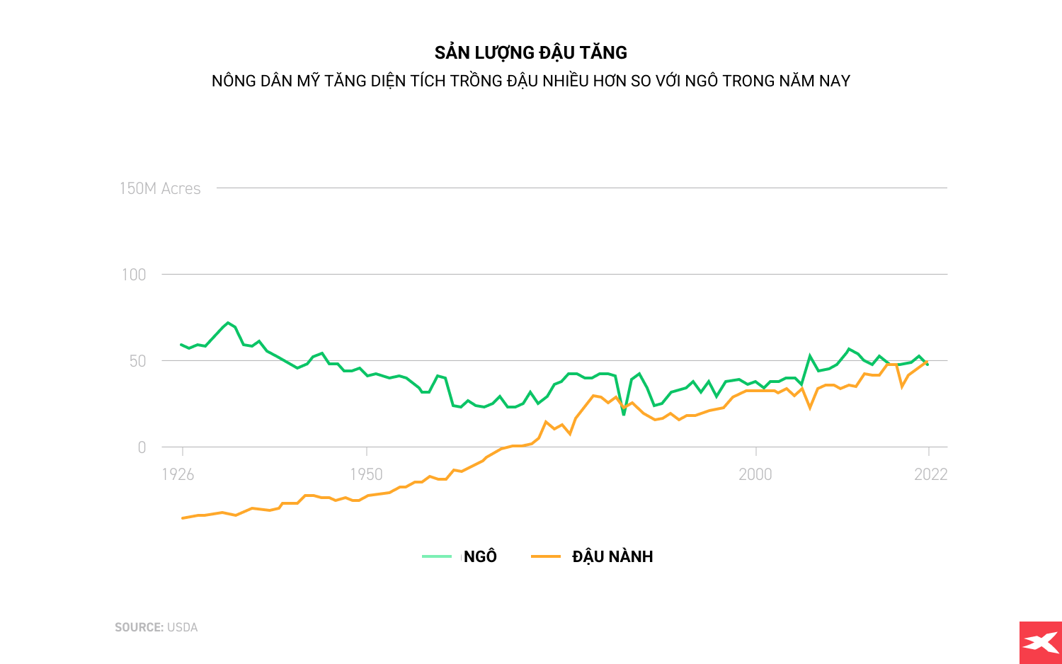 Bảng so sánh diện tích đất dành cho canh tác ngô và đậu nành từ năm 1926 đến 2022.