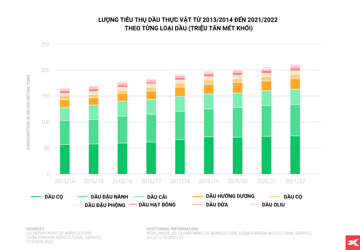 Biểu đồ tiêu thụ dầu thực vật trên toàn thế giới từ khoảng 2013/2014 đến 2021/2022. Nguồn: Statista