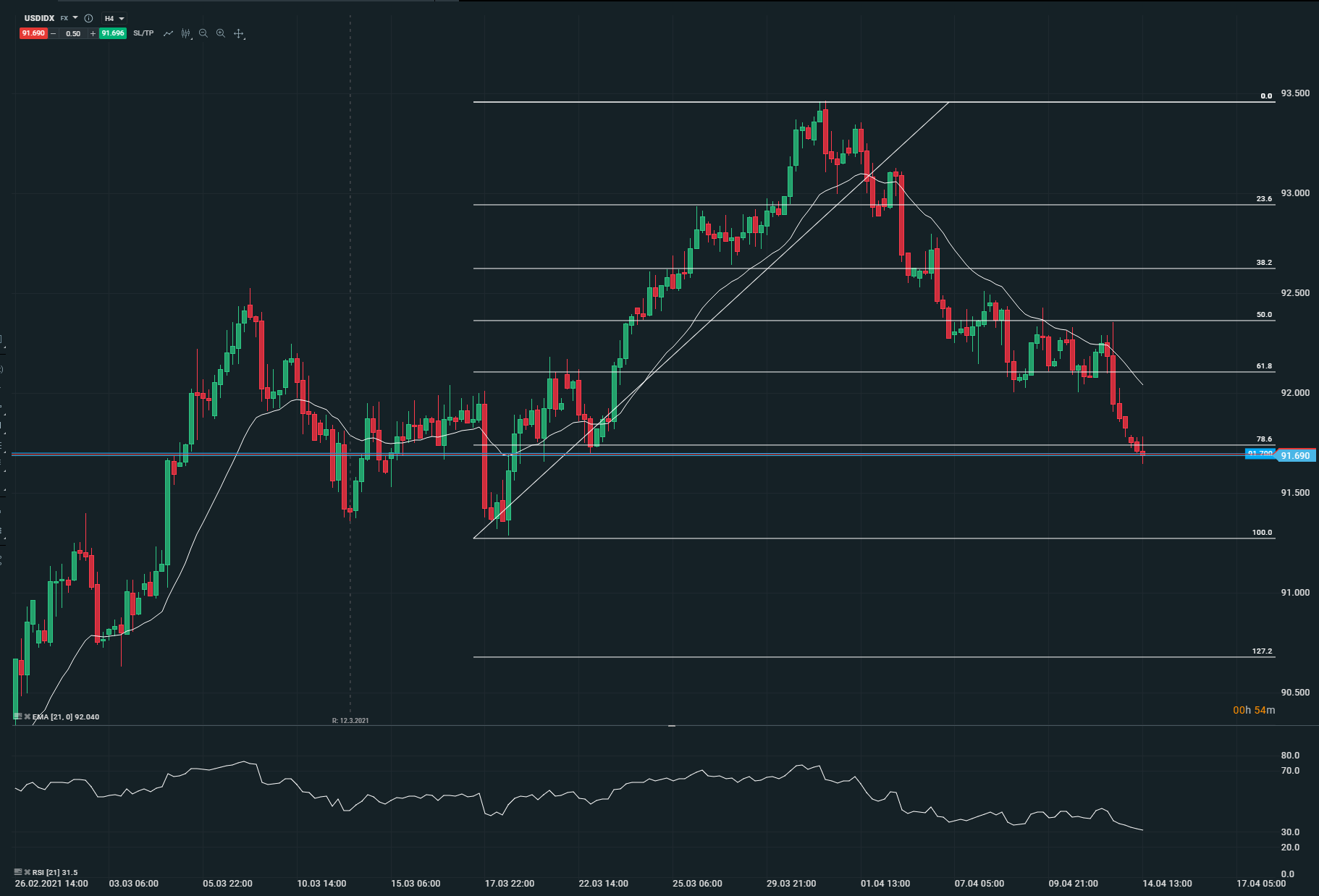 Sau đợt báo cáo kinh tế vào tối ngày 13/4/2021, chỉ số giá tiêu dùng lõi của Hoa Kỳ đã tăng lên 0.3% so với cùng kỳ tháng trước, chỉ số giá tiêu dùng cũng tăng thêm 0.9% so với cùng kỳ tháng trước, đây là mức nhảy vọt cao nhất kể từ hồi tháng 8/2012. Thị trường mặc dù đã dự đoán mức lạm phát sẽ tăng do phục hồi kinh tế cũng như các gói hỗ trợ tài chính gần đây, nhưng kết quả đưa ra lại tăng mạnh hơn so với mức dự đoán. Điều này đẩy chỉ số USDIDX xuống -0.12% và hiện giao động ở khoảng 91.700, chính là đường hỗ trợ đi qua đáy hồi 22/3/2021 vừa qua.