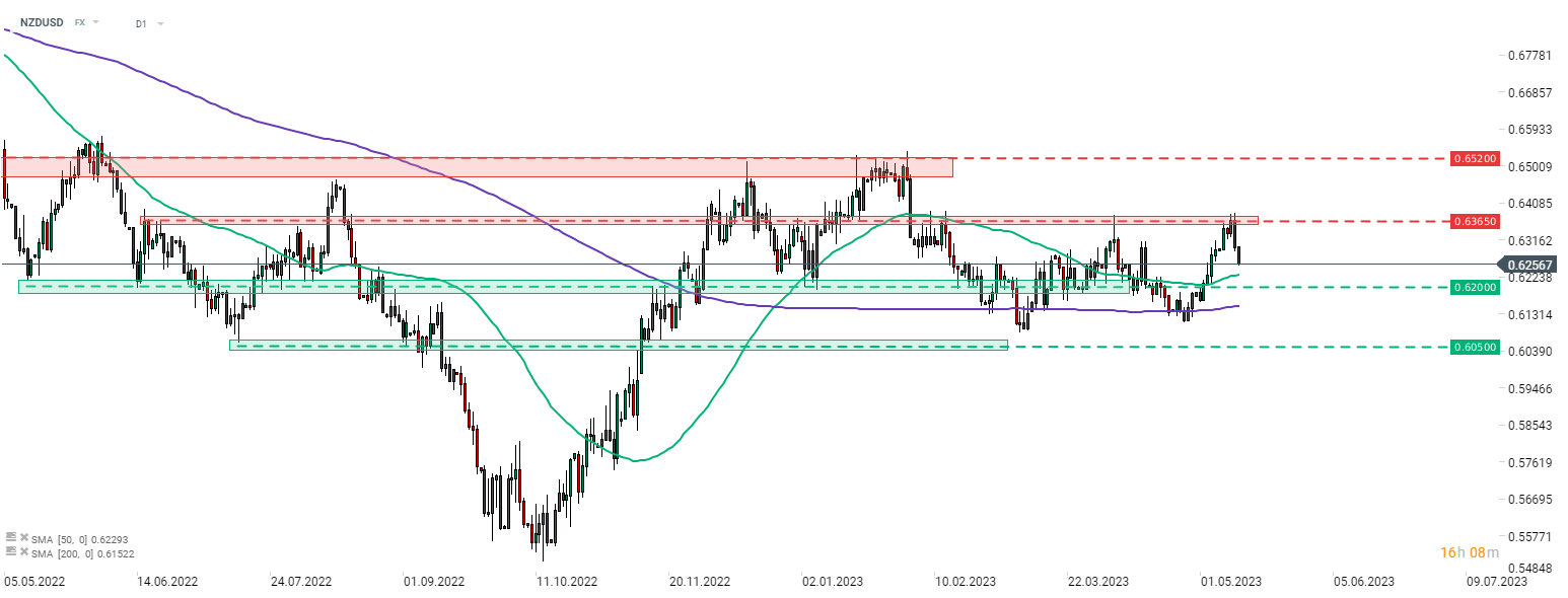 NZD là đồng tiền G10 yếu nhất sau khi kỳ vọng lạm phát mới từ RBNZ cho thấy tiến triển về lạm phát và gợi ý rằng ngân hàng có thể không cần thắt chặt đáng kể. NZDUSD thực hiện đợt thoái lui sâu hơn sau nỗ lực phá vỡ trên khu vực 0,6365 không thành công. Nguồn: xStation5