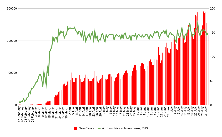 Tình hình dịch bênh đã được cải thiện với việc số ca nhiễm mới được ghi nhận tại Mỹ đạt mức thấp nhất từ ngày 5/7. Tuy nhiên, dữ liệu cuối tuần dễ xảy ra thiếu sót nên còn quá sớm để đưa ra kết luận. Nguồn: worldometers, XTB