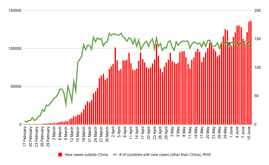 Sự gia tăng các nhiễm mới trên toàn cầu và ở Hoa Kỳ khiến các nhà đầu tư lo lắng. Nguồn: worldometers, XTB