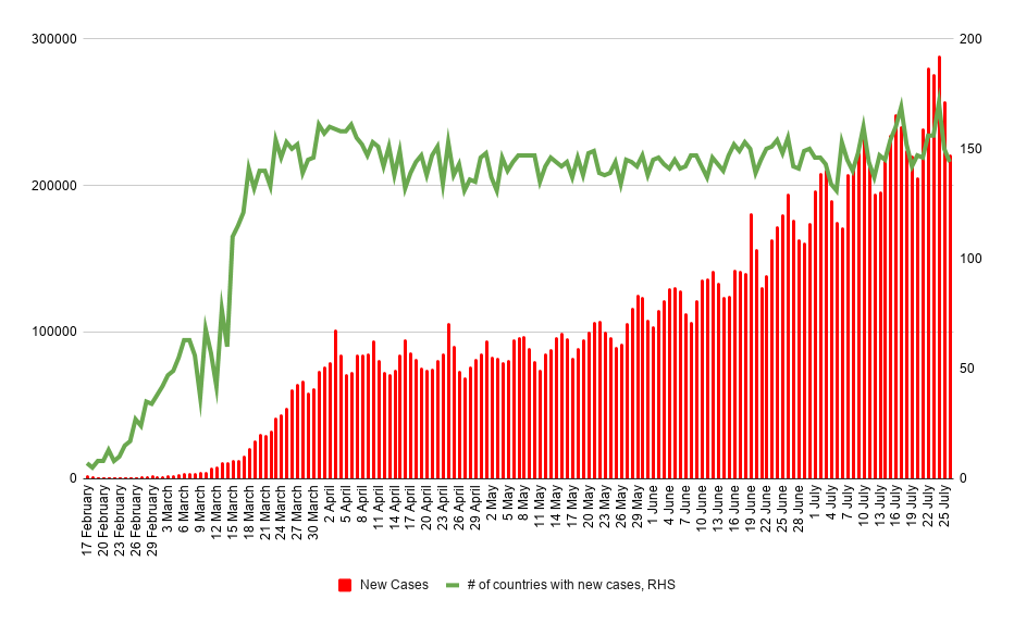 Tình hình đại dịch không được cải thiện với hơn 200.000 ca mới được báo cáo mỗi ngày. Trung Quốc cũng đang ghi nhận sự gia tăng trong số ca nhiễm mới. Nguồn: worldometers, XTB