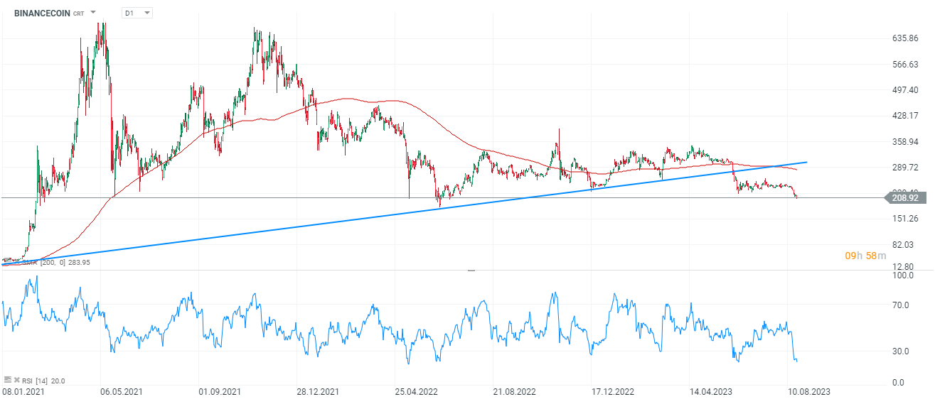 Giá Binancecoin đã phá vỡ trendline tăng và đang tiếp tục giảm xuống vùng 200 USD - đồng thời, đà giảm của chỉ số RSI trên khung D1 xuống 20 điểm cũng xác nhận tình trạng quá bán, từ đó thúc đẩy hoạt động của phe mua. Nguồn: xStation5