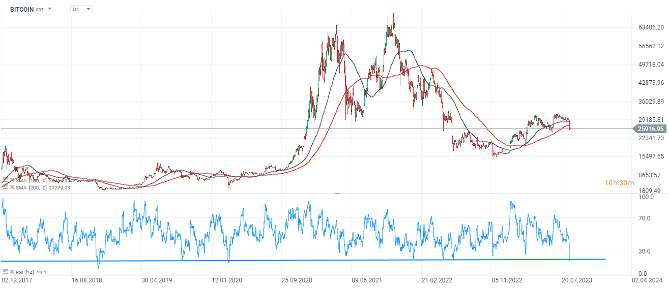 Chỉ báo RSI của Bitcoin trên khung D1 đang báo hiệu tình trạng quá bán mạnh. Đồng thời, phe mua đã không thể duy trì giá BTC trên vùng hỗ trợ 27.300 USD, từ đó khiến đà "sập" xuống sâu hơn và làm dấy lên lo ngại về xu hướng tăng trung hạn. Nguồn: xStation5