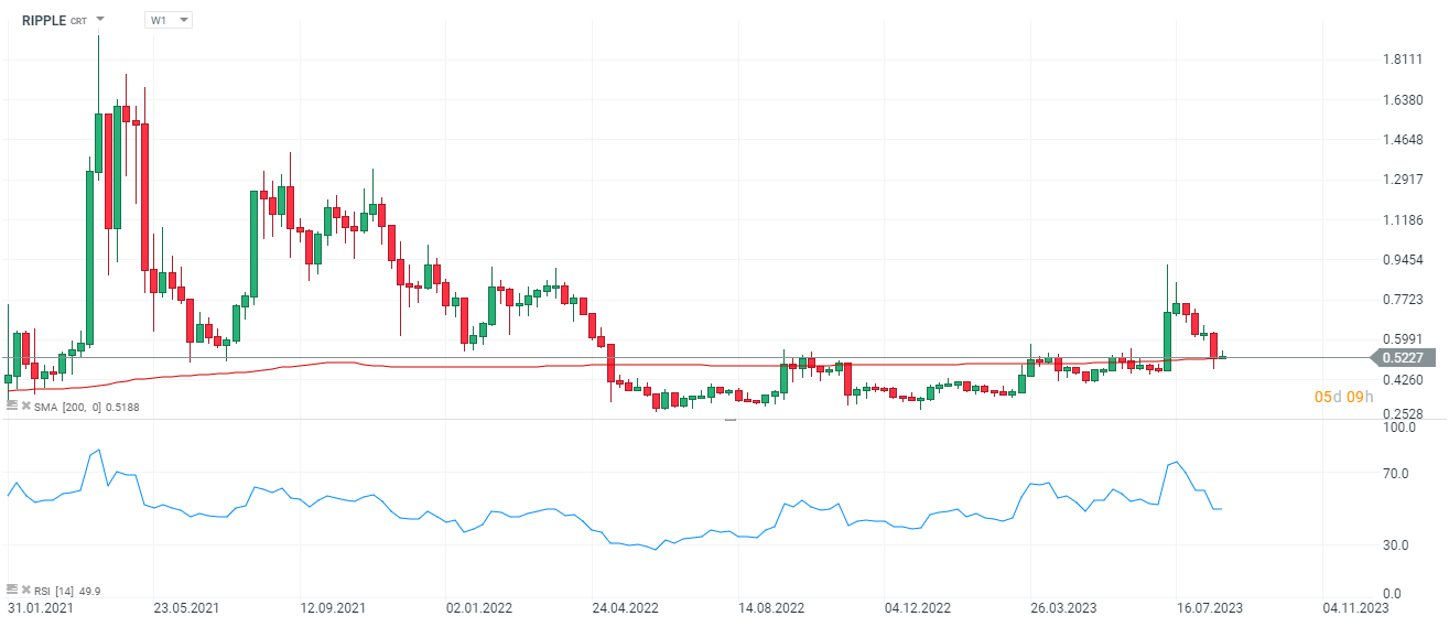 Giá Rpple đang chật vật duy trì trên ngưỡng 50 USD để mở đường cho động thái tăng cao hơn. Vùng hỗ trợ có thể được tìm thấy ở đường SMA 200 tại mức 0,52 USD ở khung hàng tuần hoặc ngay bên dưới mức 0,5 USD trong khung hàng ngày. Ripple sẽ cần phải kích hoạt đà tăng ở mức hiện tại nếu giá muốn leo lên trở lại các mức đỉnh trước đó trong thời gian tới. Nguồn: xStation5