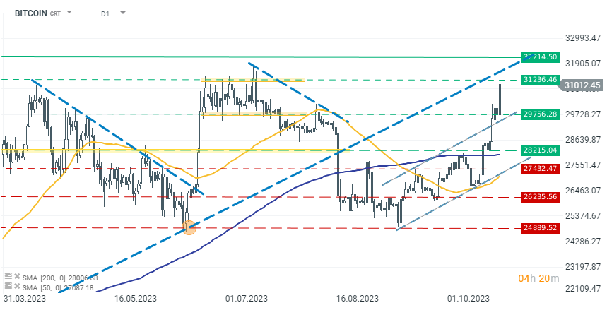 Bitcoin đang tiến đến vùng cản hợp nhất (điểm giao của kháng cự và kênh giá tăng). Mức 31.000 USD đã được ghi nhận nhiều lần với việc phe bán đẩy giá xuống trong quá khứ, nhưng trong vài ngày qua phe mua đã nắm quyền kiểm soát hoàn toàn và cùng chờ đợi liệu động lực hiện tại có đủ để khiến giá vượt qua mức kháng cự quan trọng này hay không.