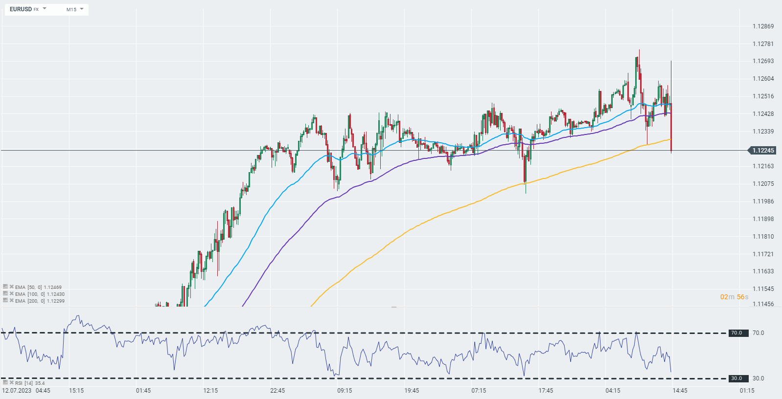 EURUSD tăng ngay sau khi bản tin được công bố, nhưng sau đó đã hoàn toàn xoá sạch đà tăng. Cặp tiền tệ vẫn di chuyển gần 1,1250. Nguồn: xStation5