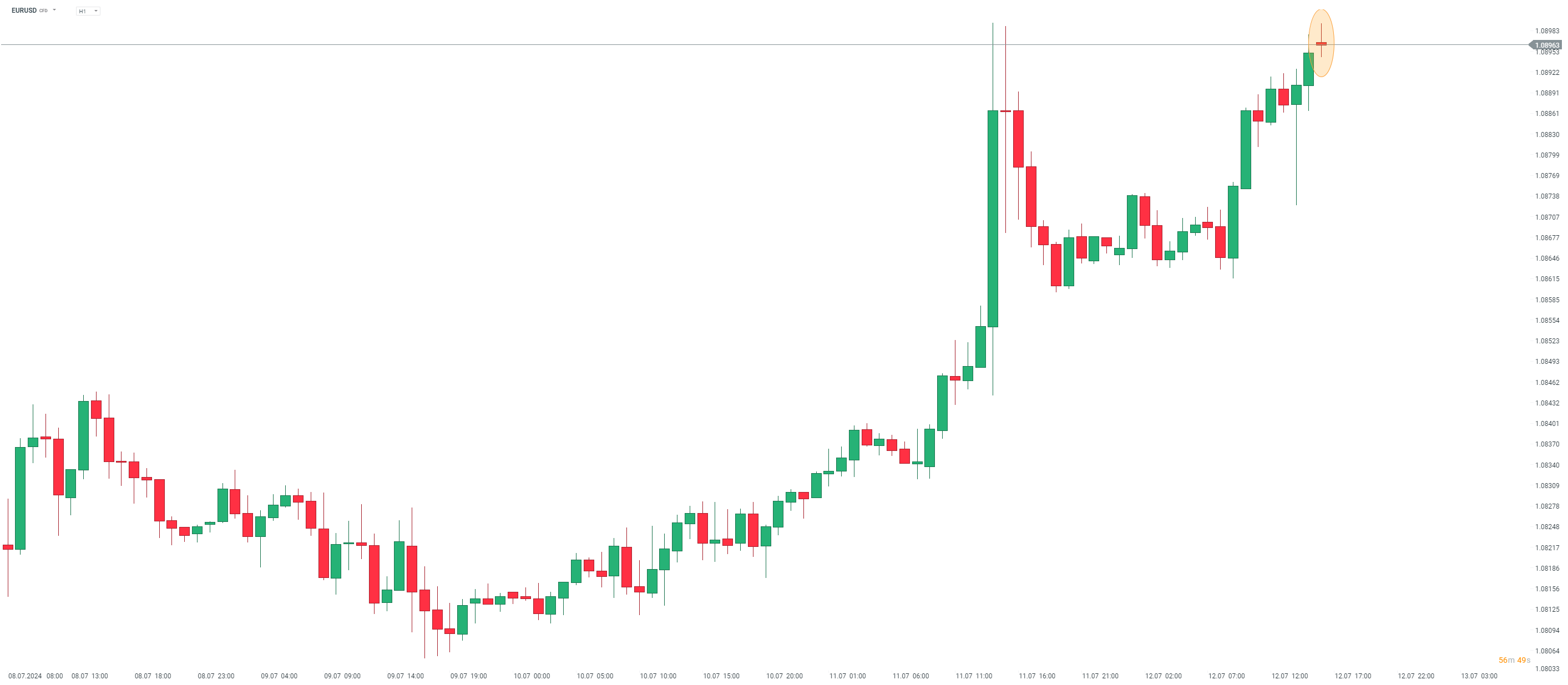 Cặp tiền EURUSD tăng vọt sau khi dữ liệu của Đại học Michigan bất ngờ suy yếu. Nguồn: xStation5