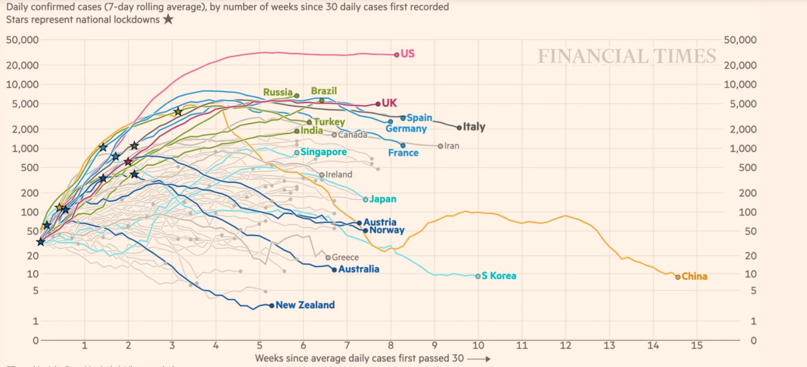So với tuần trước, chúng ta có thể quan sát thấy rằng số ca nhiễm mới hàng ngày ở một số vùng của châu Âu đã bắt đầu đi ngang. Một số quốc gia, như Ý và Pháp, thậm chí đã thấy số lượng ca nhiễm mới giảm. Nguồn: Financial Times