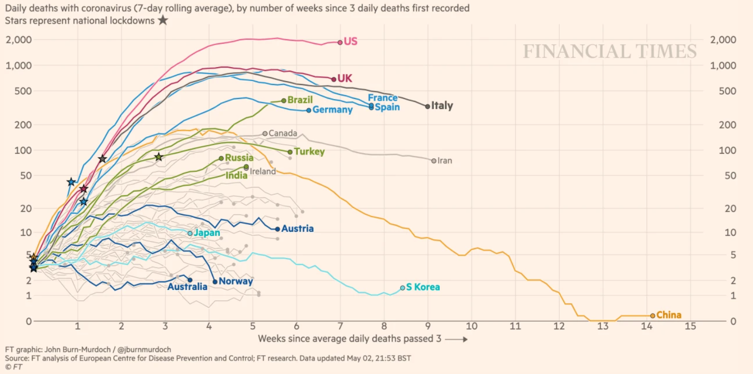 So với tuần trước, tỷ lệ tử vong hàng ngày dường như ổn định và thậm chí giảm ở một số nước phương Tây như Pháp và Tây Ban Nha. Tuy nhiên, số người chết hàng ngày vẫn đang gia tăng ở các nước thị trường mới nổi như Ấn Độ, Nga và Brazil. Nguồn: Financial Times