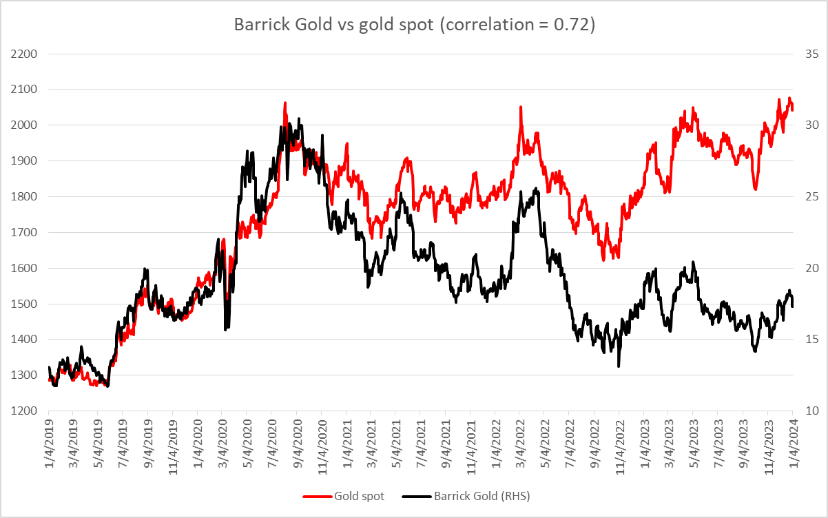 Barrick Gold là một trong những công ty có sản lượng khai thác vàng lớn nhất thế giới. Công ty đã sản xuất 4,14 triệu ounce vàng vào năm 2022 (dữ liệu gần đây nhất) và chỉ đứng sau mức sản lượng của Newmont Corporation, với 5,96 triệu ounce vàng được sản xuất. Doanh số bán vàng chiếm khoảng 90% doanh thu của Barrick trong những quý gần đây nên không có gì ngạc nhiên khi cổ phiếu của công ty có mối tương quan chặt chẽ với sự biến động của giá vàng. Mối tương quan này mạnh đến mức nào? Xét về hệ số tương quan giữa lợi nhuận hàng ngày từ Barrick Gold và mức giá vàng giao ngay trong 5 năm qua, hệ số tương quan giữa hai yếu tố này là 0,72 (hệ số tương quan này có nghĩa là 72% biến động giá của cổ phiếu Barrick Gold có thể được giải thích bởi biến động giá vàng giao ngay)!