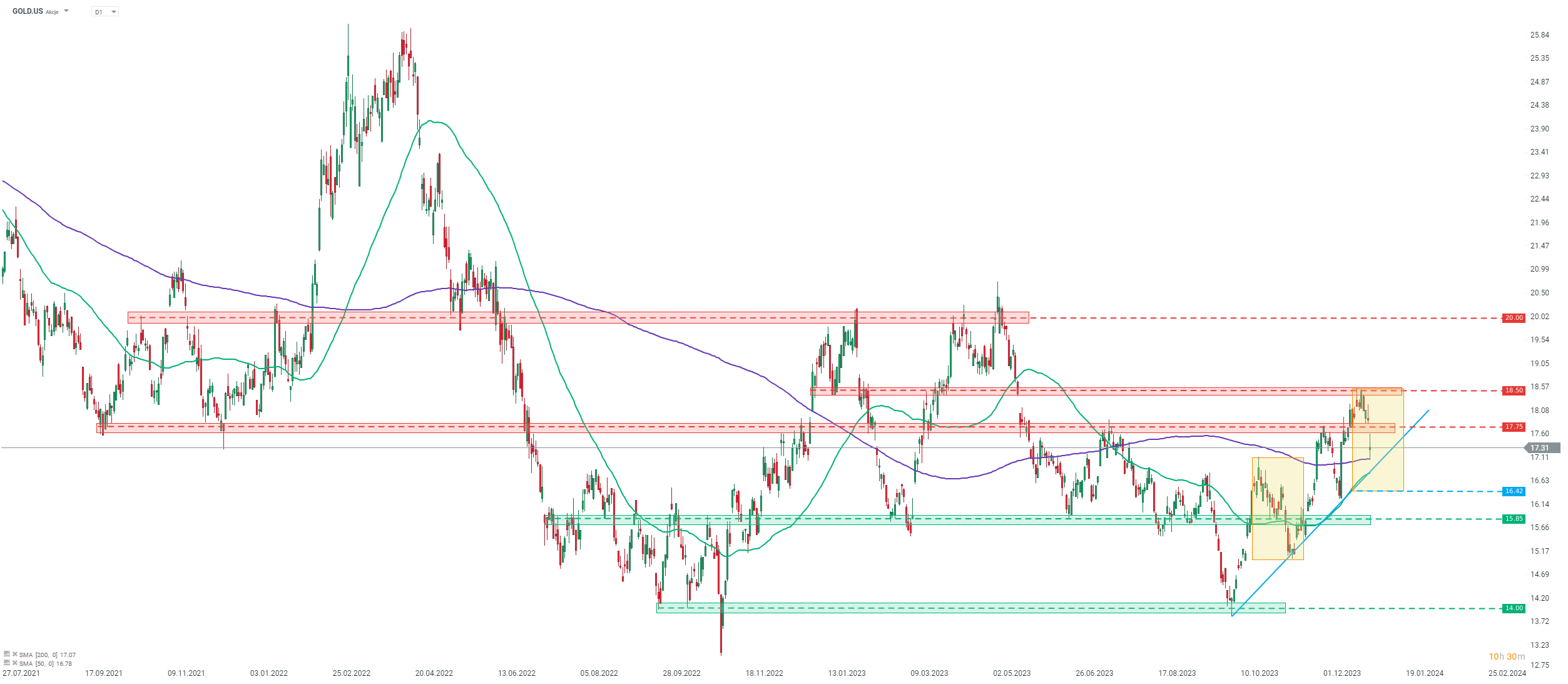 Nhìn vào biểu đồ của Barrick Gold (GOLD.US) trên khung thời gian D1, có thể thấy báo cáo của Bloomberg về các cuộc đàm phán mua lại First Quantum đã khiến giá cổ phiếu của công ty giảm khoảng 3%. Cổ phiếu đã giảm xuống đến đường trung bình SMA200 (đường màu tím) và sau đó đã phục hồi trở lại. Sự thoái lui này có vẻ như chỉ là một đợt điều chỉnh, vì cổ phiếu chưa phá vỡ ra khỏi đường xu hướng tăng, mức đáy ngắn hạn trước đó hoặc cạnh dưới của hình chữ nhật. Trường hợp giá cổ phiếu giảm xuống dưới mức 16,40 USD (tương đương khoảng 5% so với giá đóng cửa ngày hôm qua) thì đó sẽ là một lý do đáng lo ngại, nhưng cho đến khi điều đó xảy ra thì xu hướng tăng vẫn là kịch bản chính. Nếu phe mua lấy lại quyền kiểm soát và đẩy cổ phiếu lên cao hơn, các mức kháng cự ngắn hạn cần theo dõi có thể được tìm thấy ở các vùng 17,75 USD và 18,50 USD.
