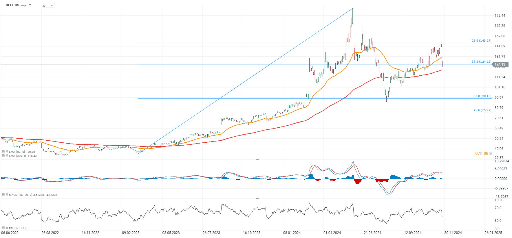 Cổ phiếu DELL đang phản ứng với mức Fibonacci thoái lui 38,2% của xu hướng tăng bắt đầu từ quý cuối năm 2022, ngay sau khi ChatGPT được ra mắt.