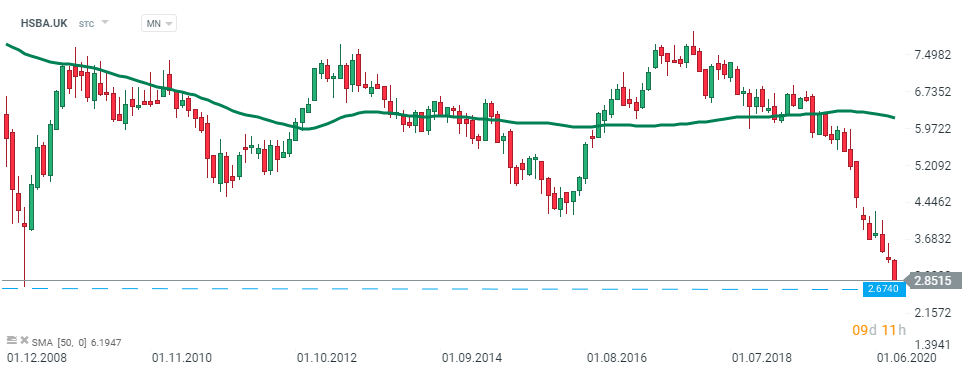 Cổ phiếu HSBC (HSBA.UK) mở cửa phiên giao dịch hôm nay với gap giảm và đang hướng tới hỗ trợ ở mức 2,67 - mức chưa từng thấy kể từ tháng 3 năm 2009. Nguồn: xStation5