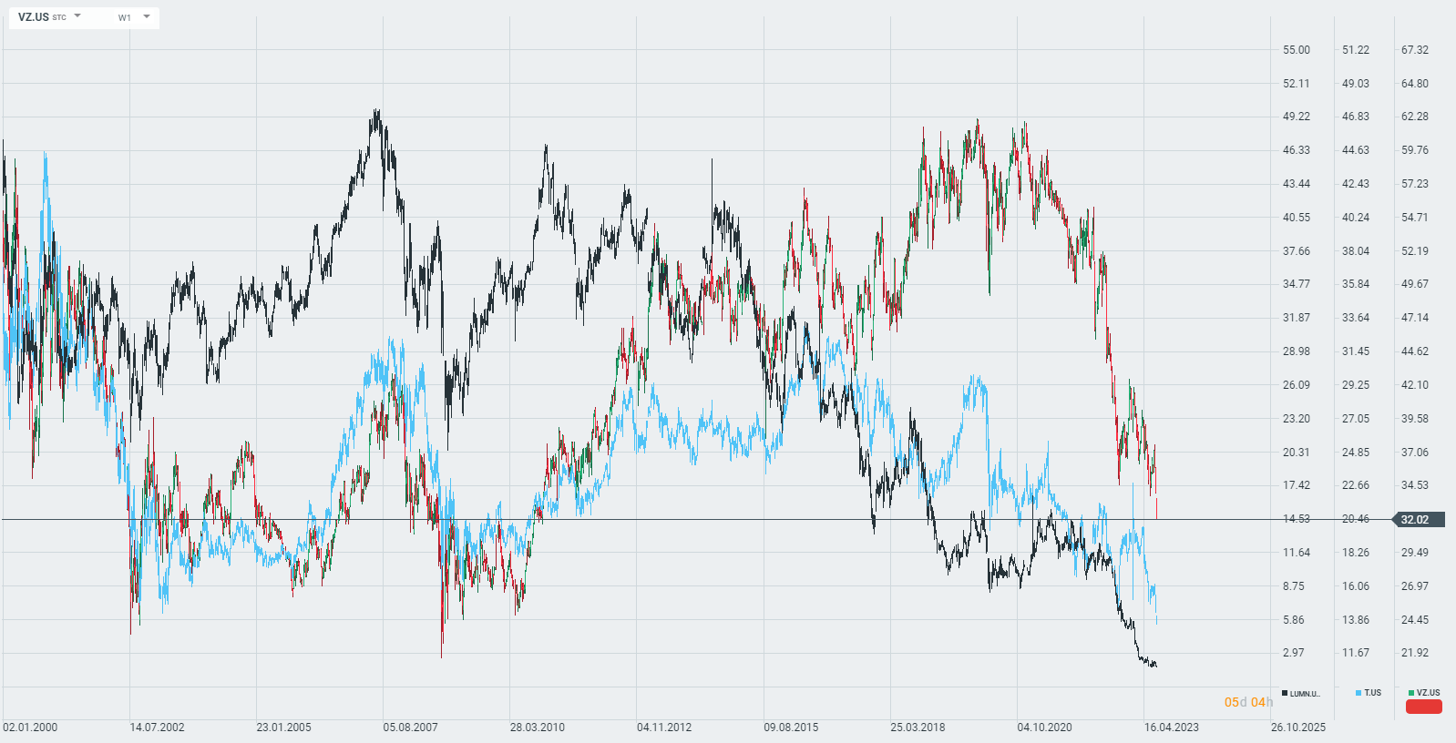 Cổ phiếu của Verizon (VZ.US) và AT&T (T.US) gần đây đang chịu áp lực giảm mạnh do vụ bê bối liên quan đến chì được công bố rộng rãi tại Mỹ. Vấn đề nằm tại các dây cáp điện thoại đã được lắp đặt từ lâu ở Mỹ có lớp phủ chì.