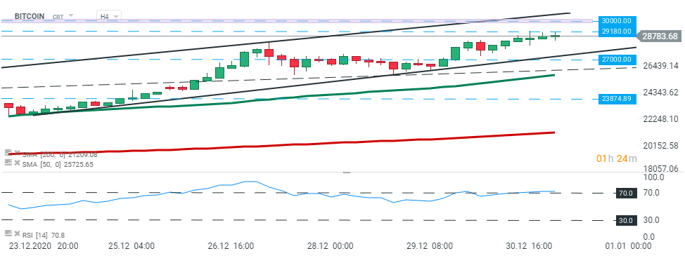 Bitcoin đã giảm nhẹ sau khi đạt mức cao nhất mọi thời đại mới. Nếu tâm lý hiện tại chiếm ưu thế, thì một xung lực đi lên khác đối với mức tâm lý $30.000 có thể được đưa ra. Mặt khác, một sự điều chỉnh sâu hơn có thể xảy ra trong vài ngày tới khi giá di chuyển vào vùng quá mua theo RSI. Ngoài ra, Bitcoin cũng cho thấy sự biến động giá mạnh mẽ lên đến $2.500 trong những ngày gần đây, vì vậy kịch bản này dường như không xảy ra. Mức hỗ trợ chính gần nhất để theo dõi nằm ở $27.000. Nguồn: xStation5