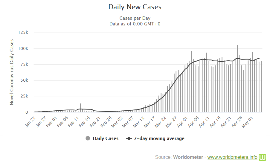Hôm qua, số ca nhiễm mới đạt 81 247 ca và tăng nhẹ so với thứ Hai khi 79 582 ca nhiễm mới được ghi nhận. Tuy nhiên, con của ngày hôm qua thấp hơn mức trung bình 7 ngày, hiện là 84 038. Nguồn: Worldometer