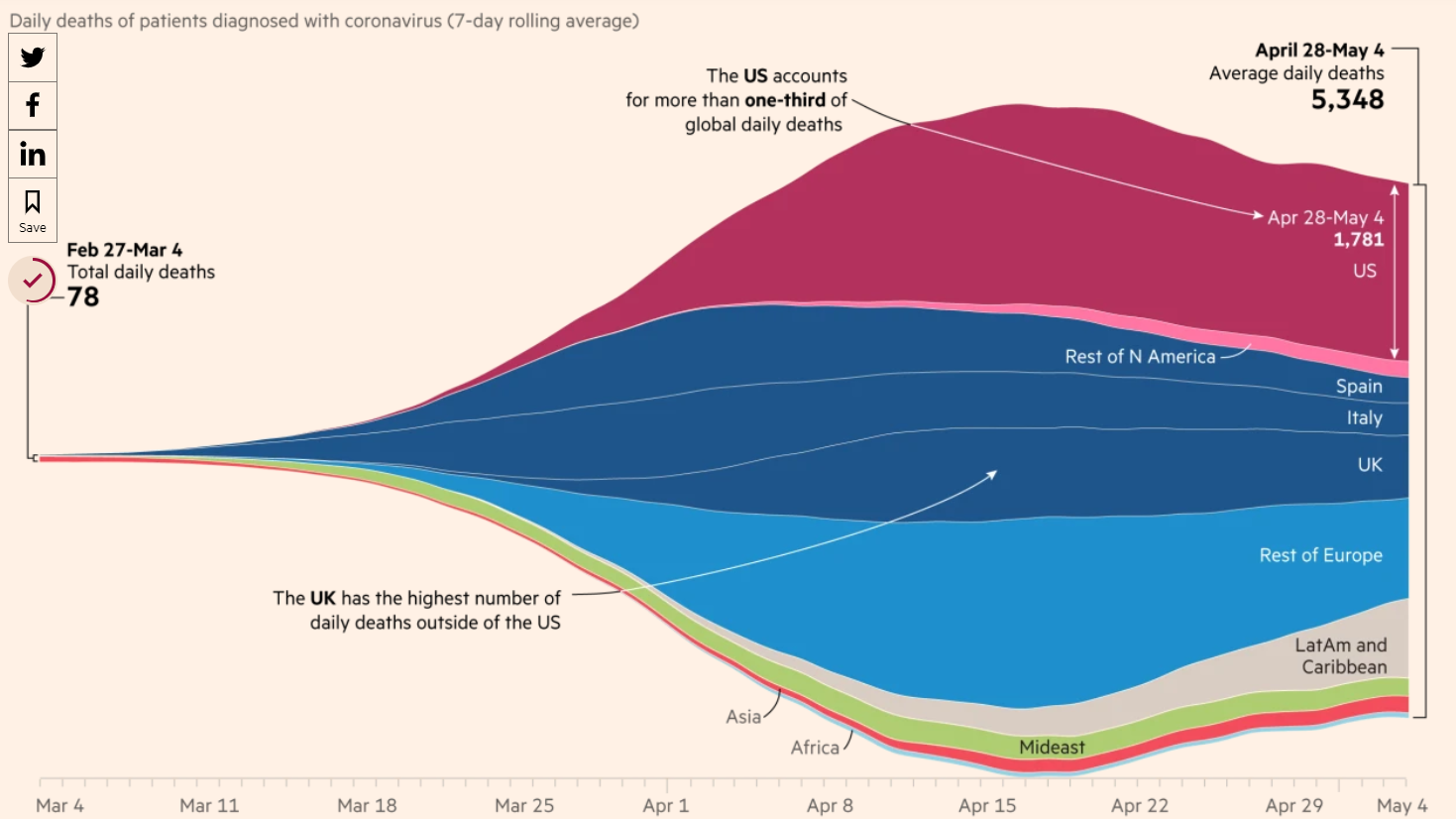 • Hoa Kỳ là quốc gia có nhiều ca tử vong do virus gây ra với hơn 72 nghìn người, tiếp theo là Anh, Ý, Tây Ban Nha và Pháp.