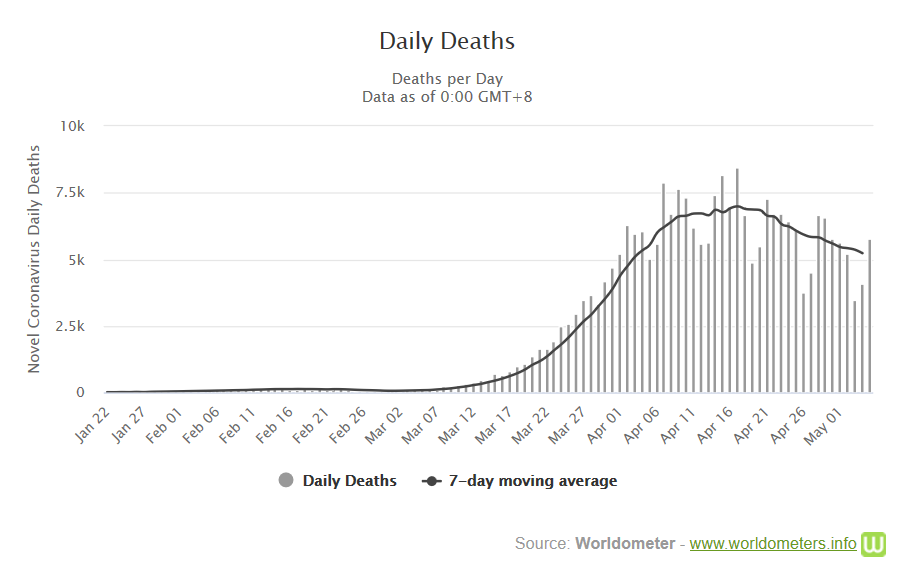 Số người chết hàng ngày tăng đáng kể lên 5 787 ngày hôm qua so với 4 096 từ thứ Hai. Con số đã vượt quá mức trung bình 7 ngày, hiện là 5 227. Nguồn: Worldmeter