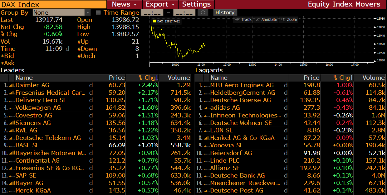 Các thành viên của DAX lúc 10:09 sáng GMT. Nguồn: Bloomberg