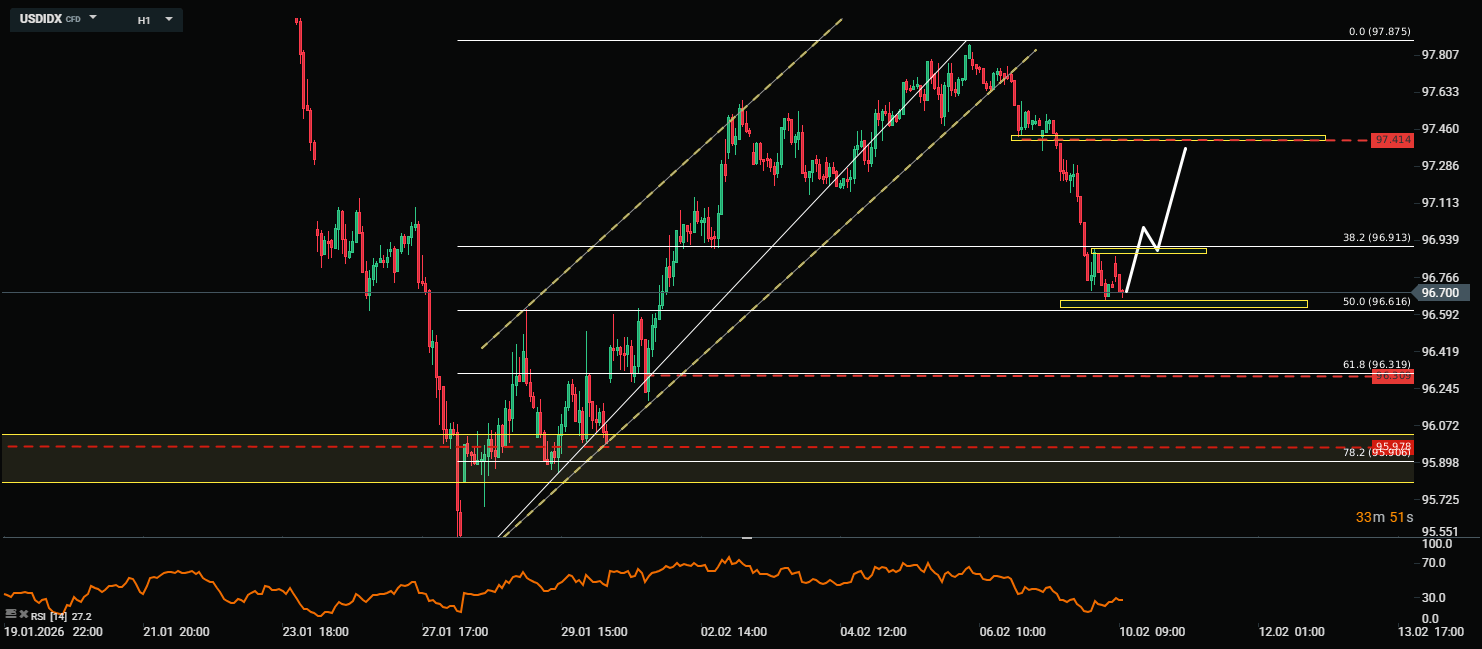 Sau nhịp tăng mạnh gần đây, chỉ số USDIDX đã điều chỉnh đáng kể và lùi về vùng Fibonacci thoái lui 50% của đà tăng trước đó. Tại khu vực này, đà giảm đang có dấu hiệu chững lại, tuy nhiên thị trường vẫn chưa ghi nhận tín hiệu đủ rõ ràng cho thấy động lực tăng đã thực sự quay trở lại. Dù vậy, vùng giá hiện tại vẫn có thể được xem là một điểm tựa tiềm năng cho một nhịp hồi phục ngắn hạn. Cụ thể, chỉ báo RSI đã giảm về vùng quá bán và đồng thời xuất hiện tín hiệu phân kỳ, cho thấy lực bán đang suy yếu dần. Đây là yếu tố có thể tạo tiền đề để chỉ số hình thành một nhịp phục hồi trong phiên hôm nay. Tuy nhiên, trường hợp áp lực bán vẫn tiếp tục gia tăng thì điểm cản tiếp theo sẽ là vùng 96.31.